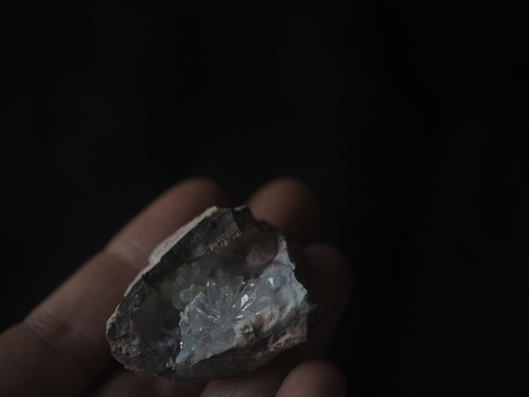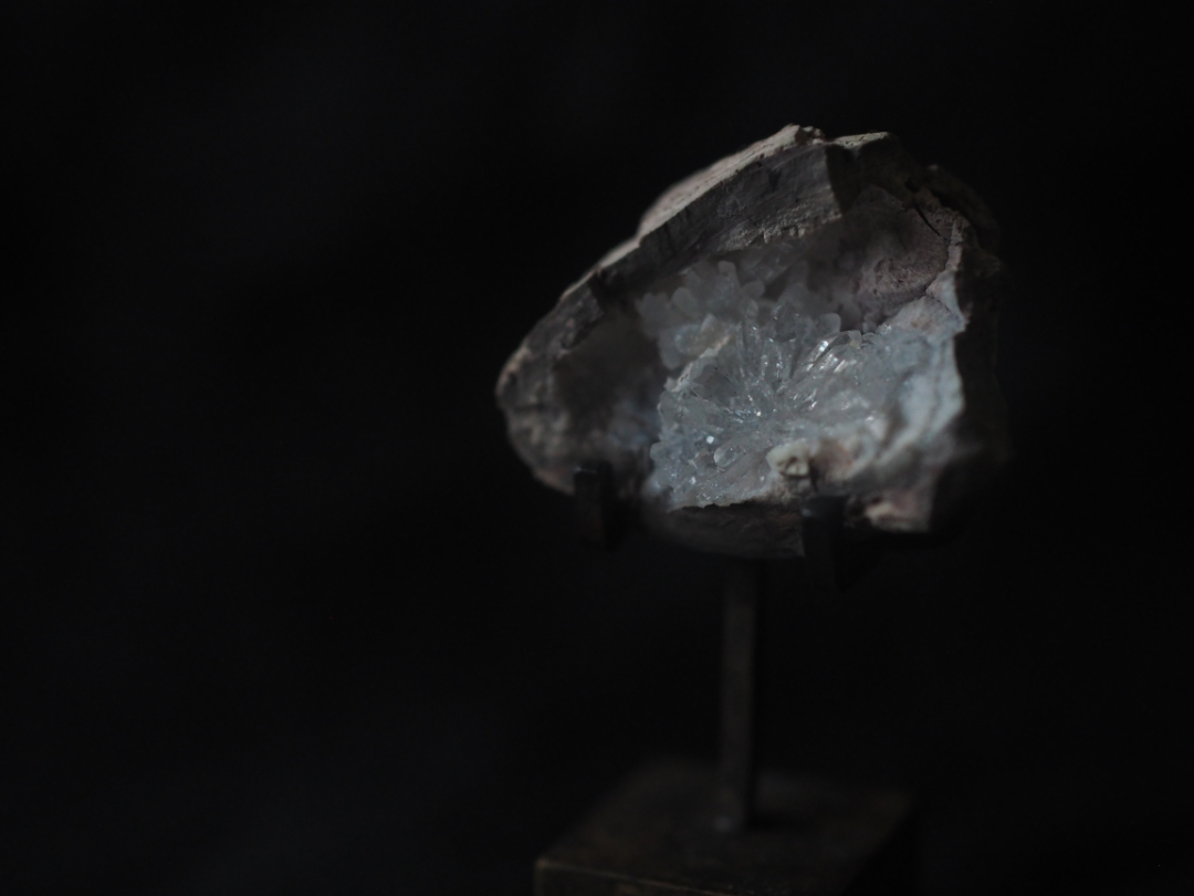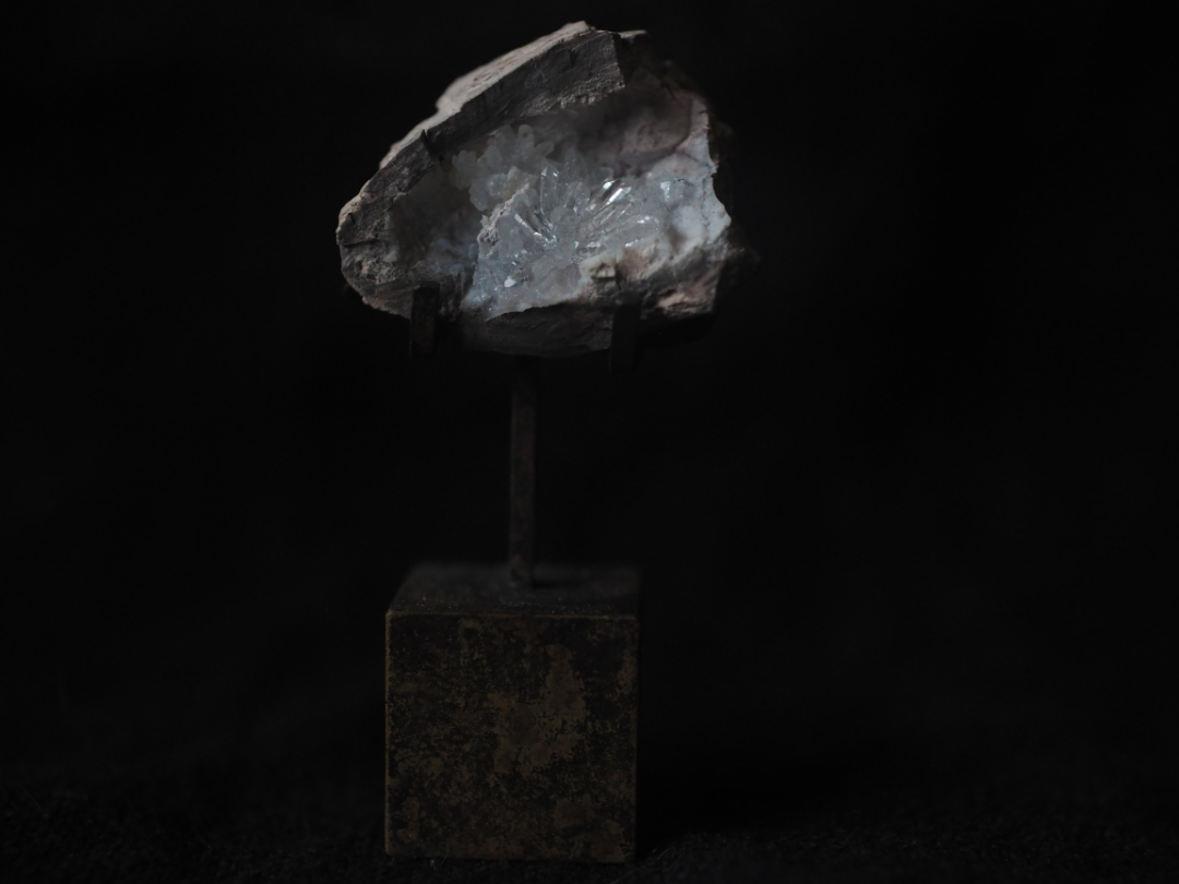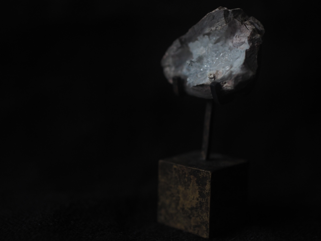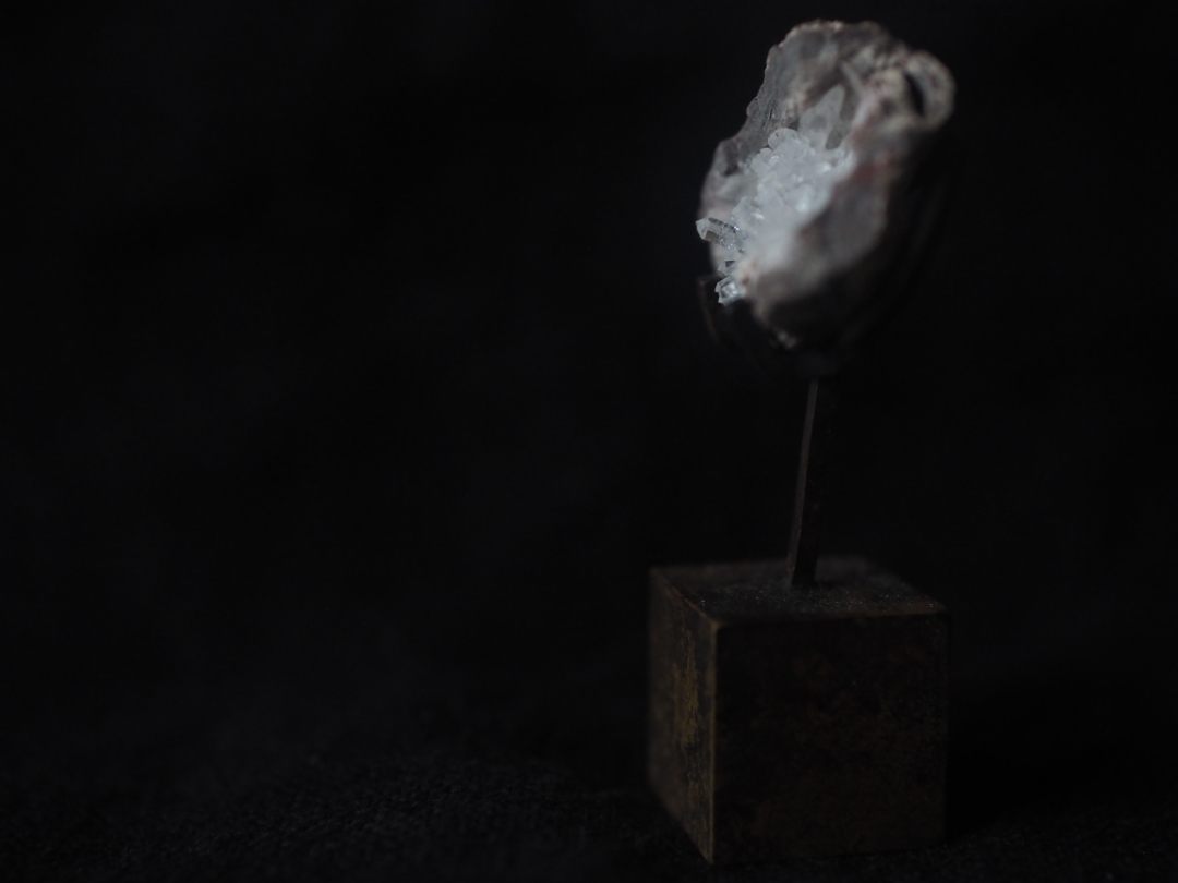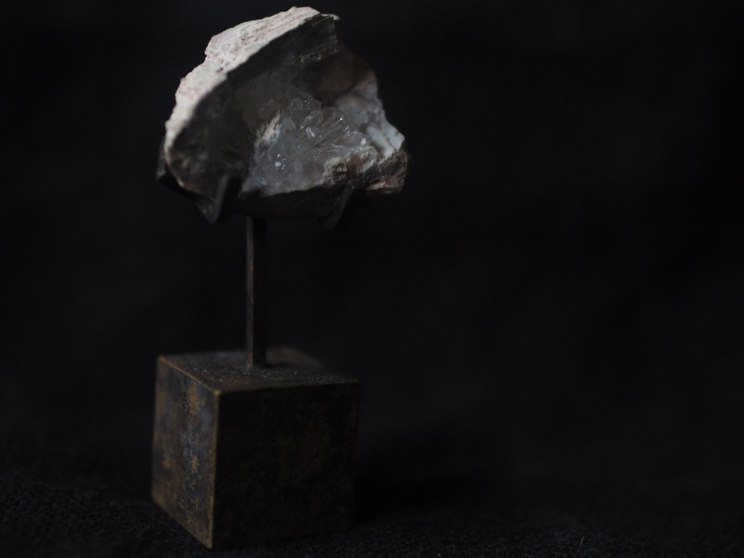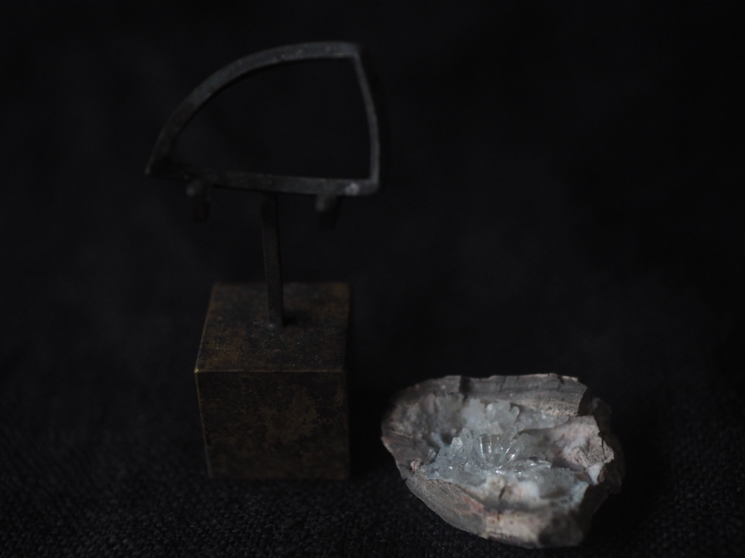 晶洞となった透明度の高いquartzの原石を、真鍮を用いてobjectに仕立てました。