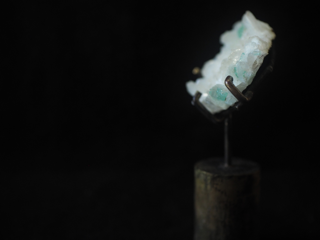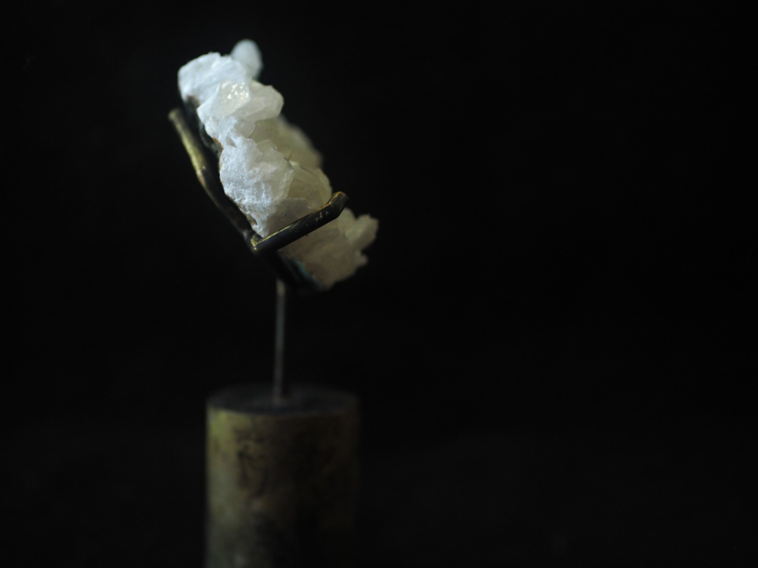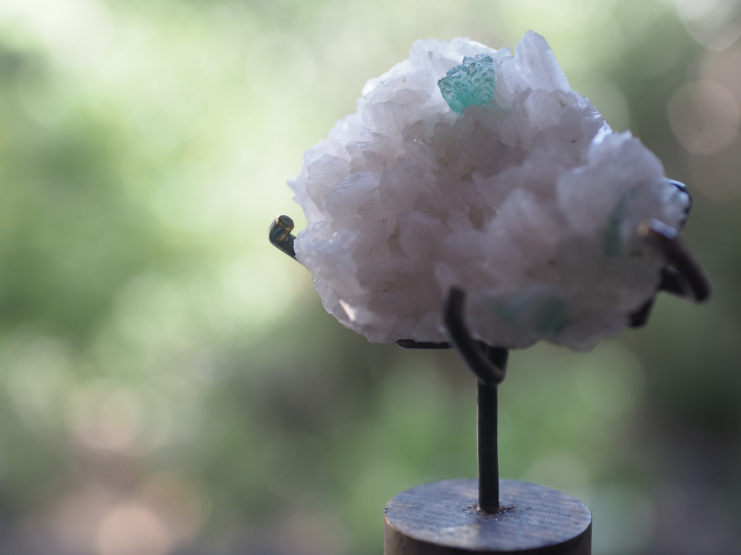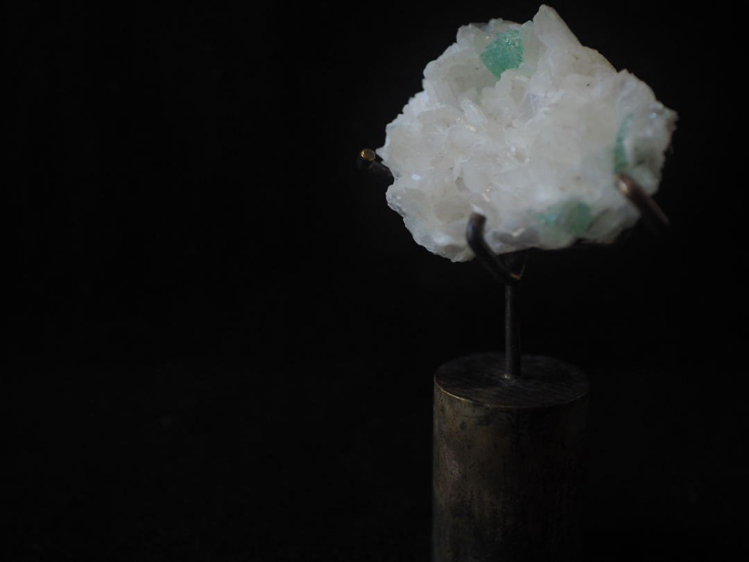 色鮮やかなapophylliteと煌めきが美しいstillbiteの共生原石を真鍮を用いて、