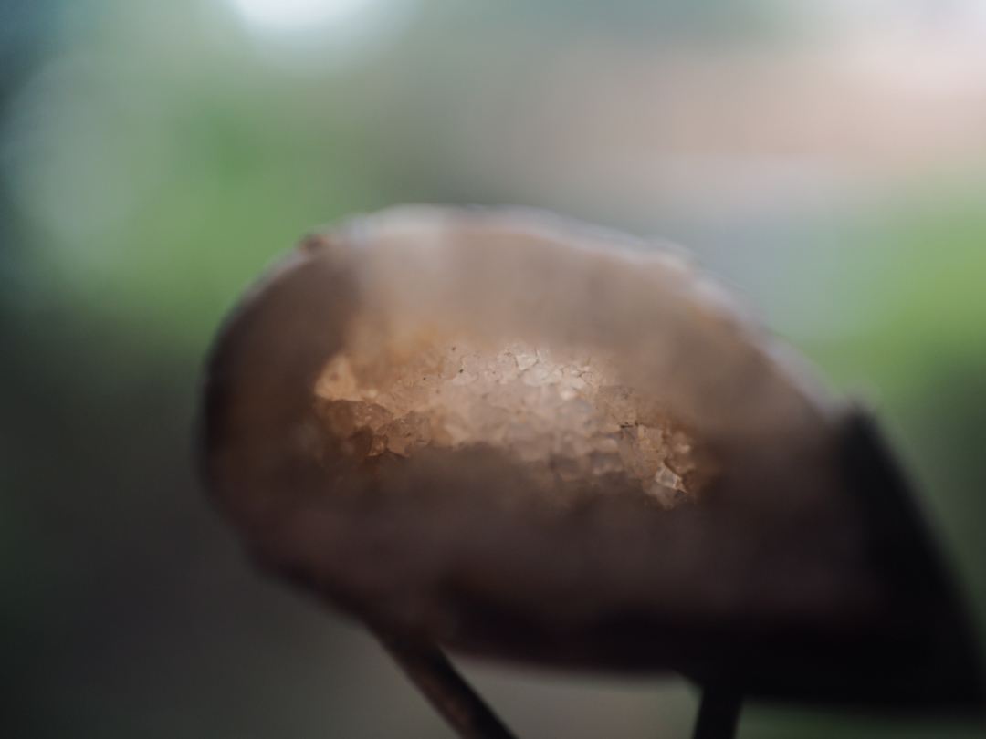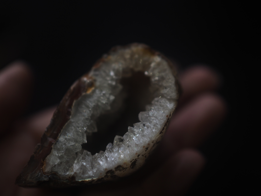 透明度の高い結晶が集まったquartz geodeの原石を、