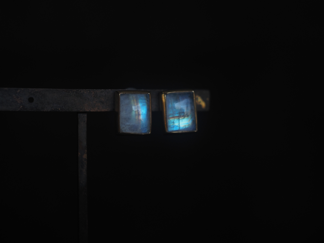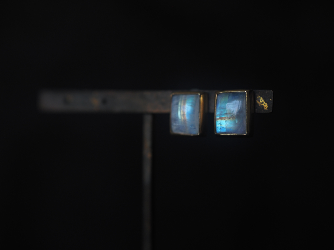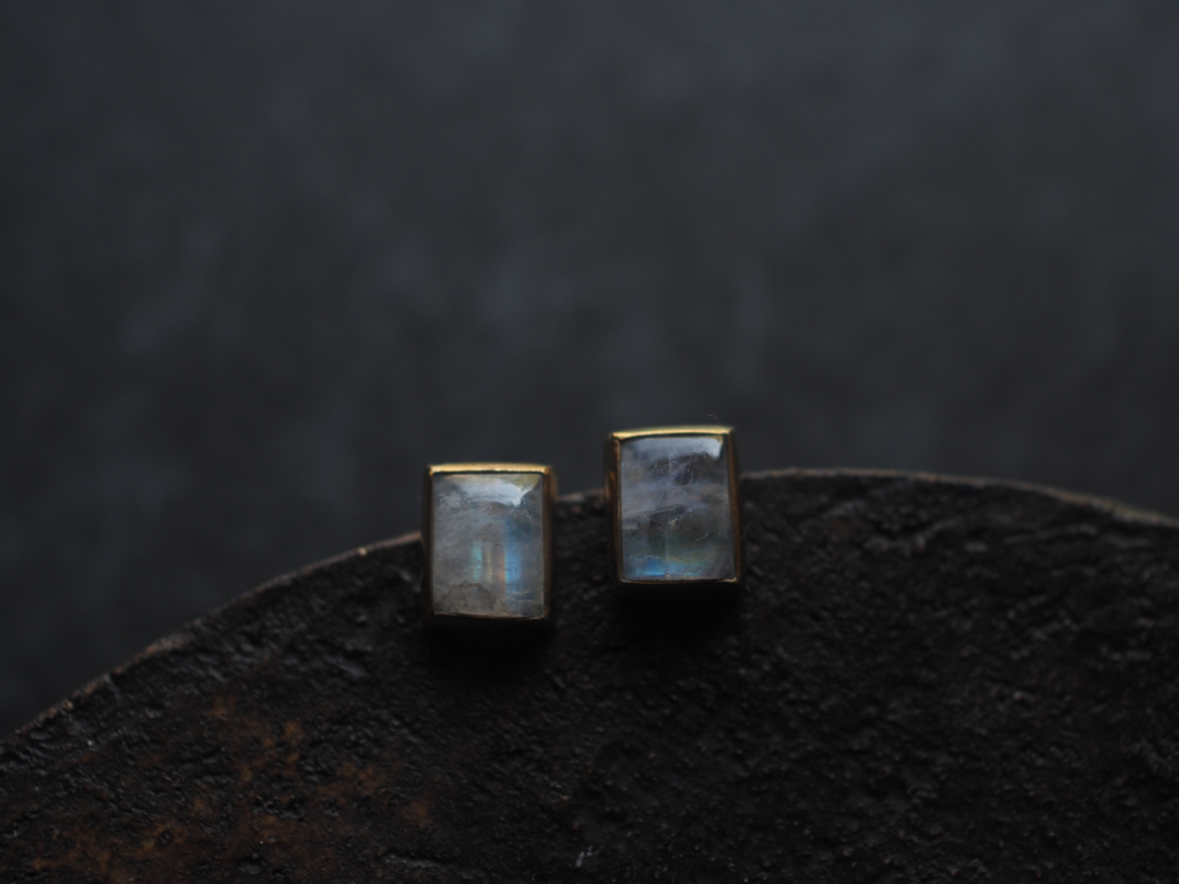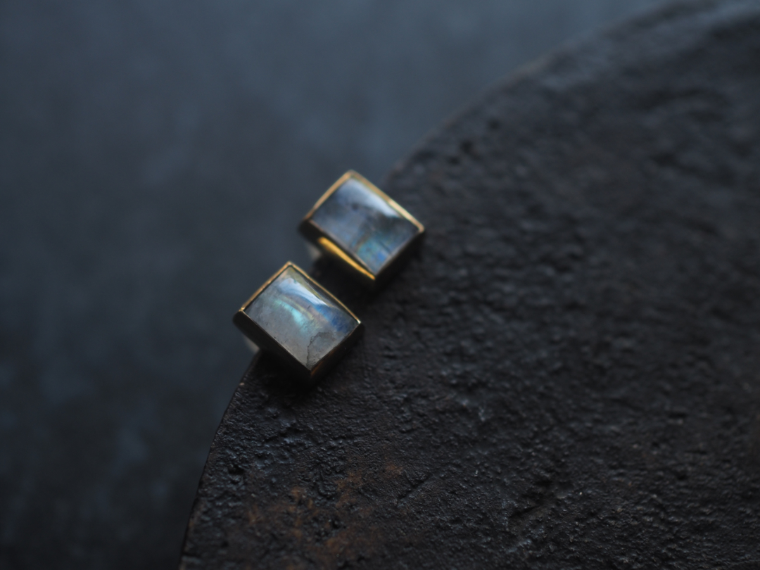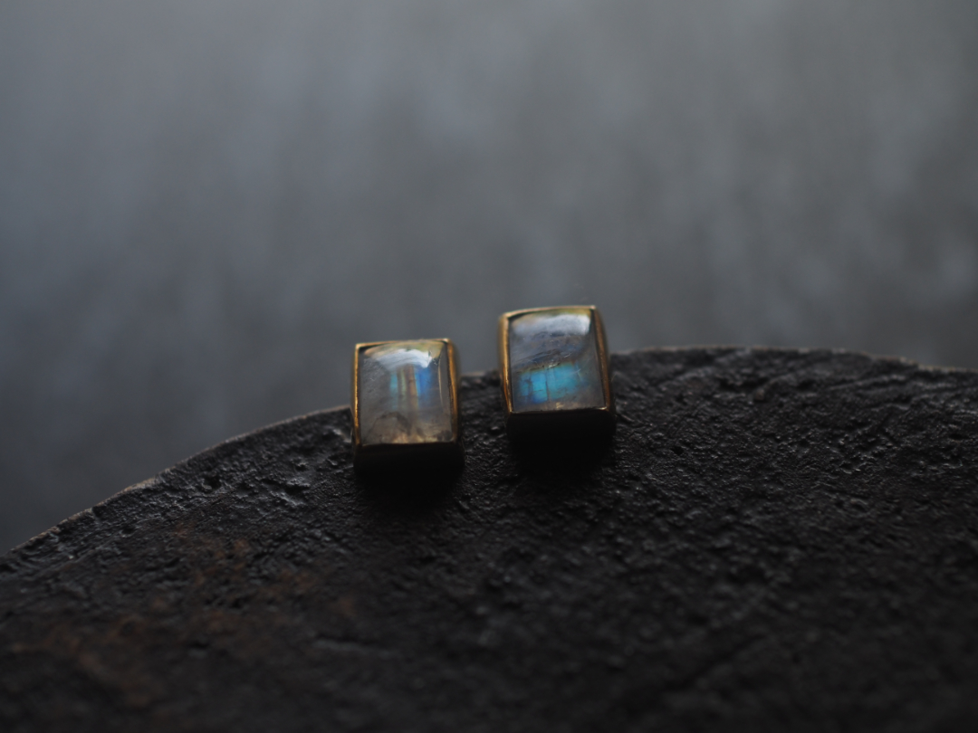 虹色に輝くwhite labradoriteを真鍮を用いて、pierceに仕立てました。