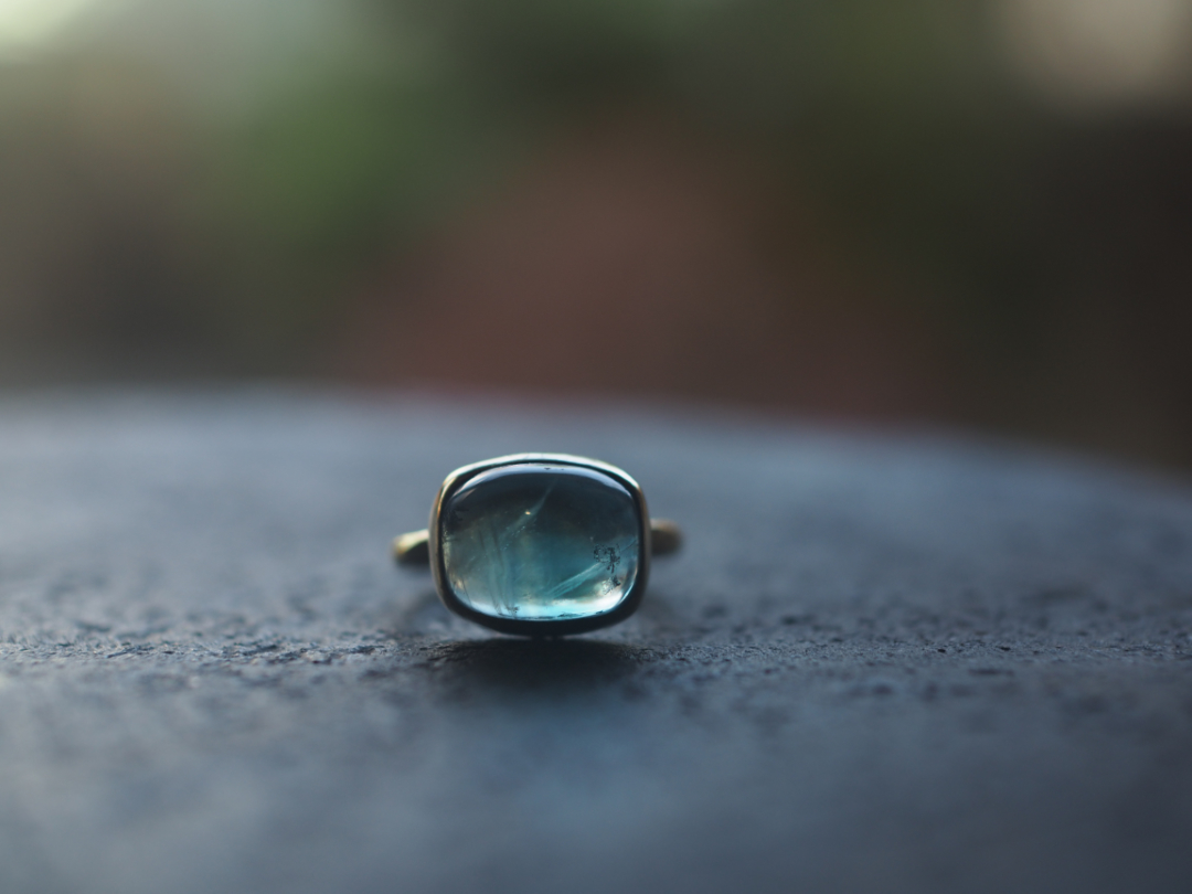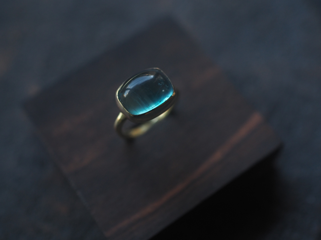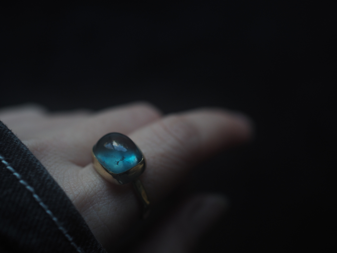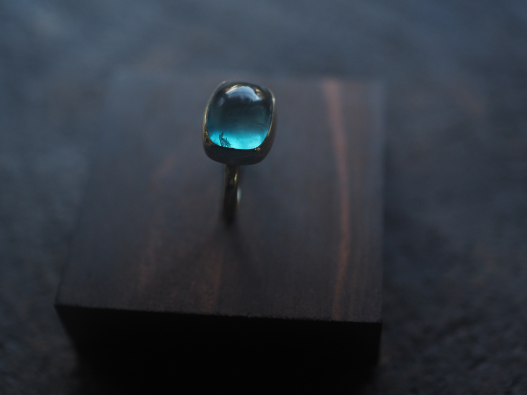 珍しい形に研磨されたfluoriteを真鍮を用いて、ringに仕立てました。