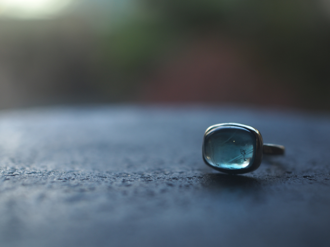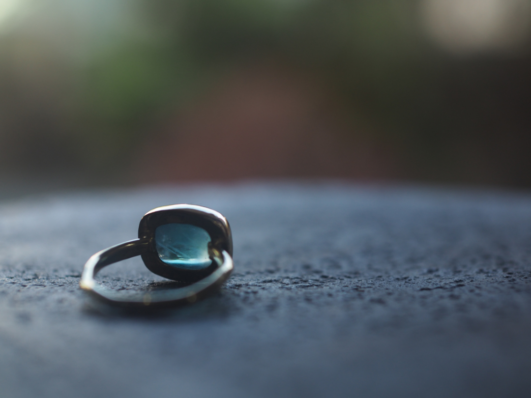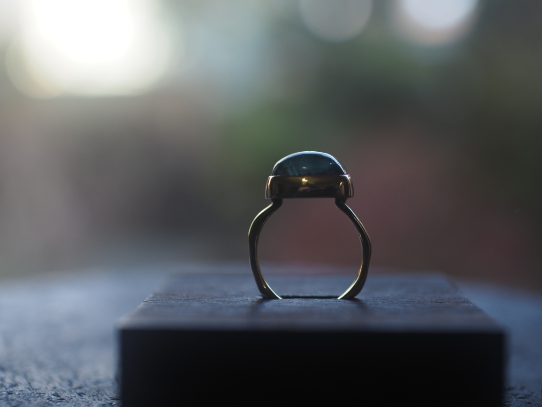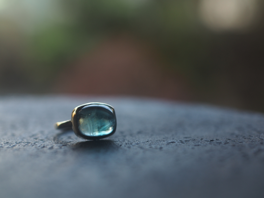 珍しい形に研磨されたfluoriteを真鍮を用いて、ringに仕立てました。