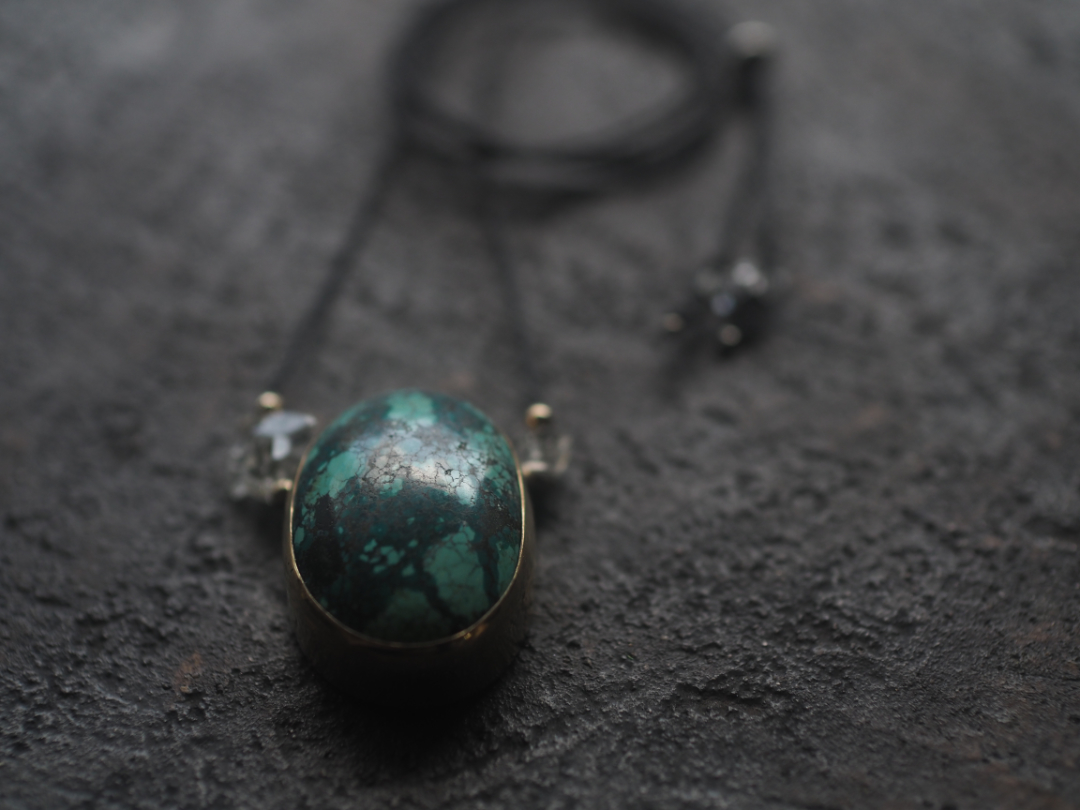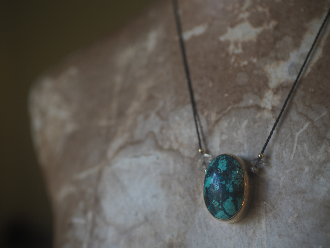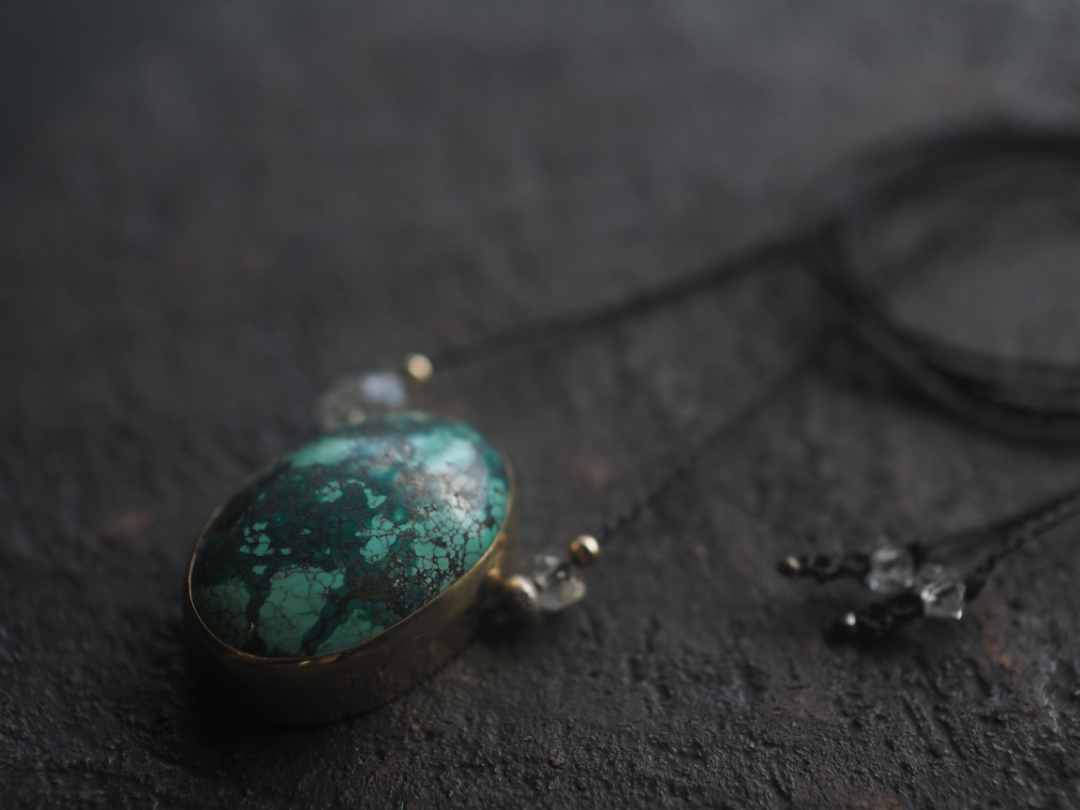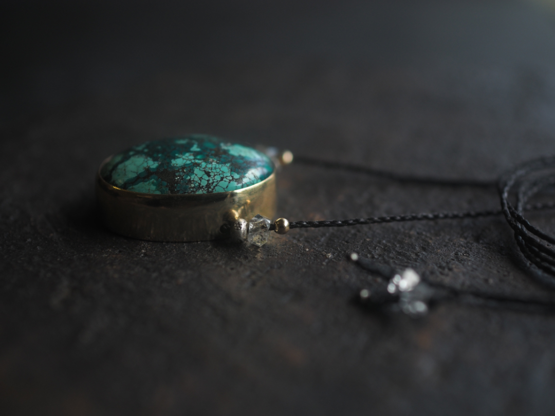 独特な模様のturquoiseを真鍮を用いて、necklaceに仕立てました。