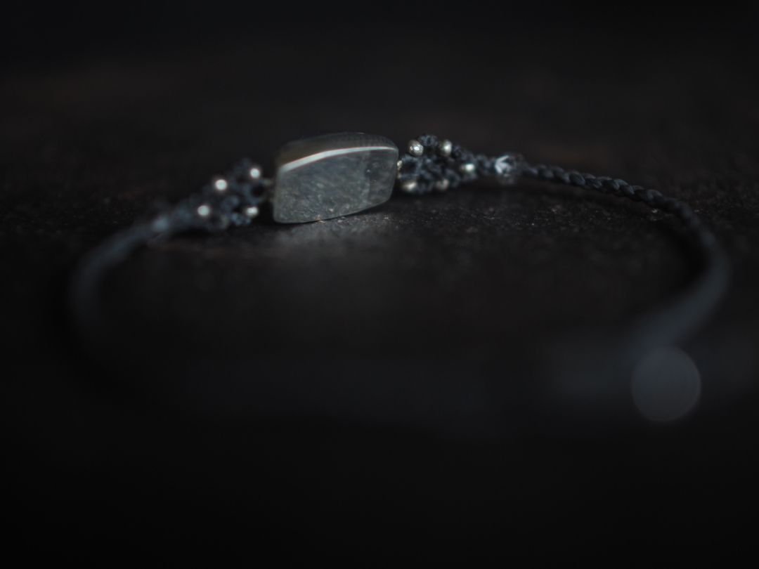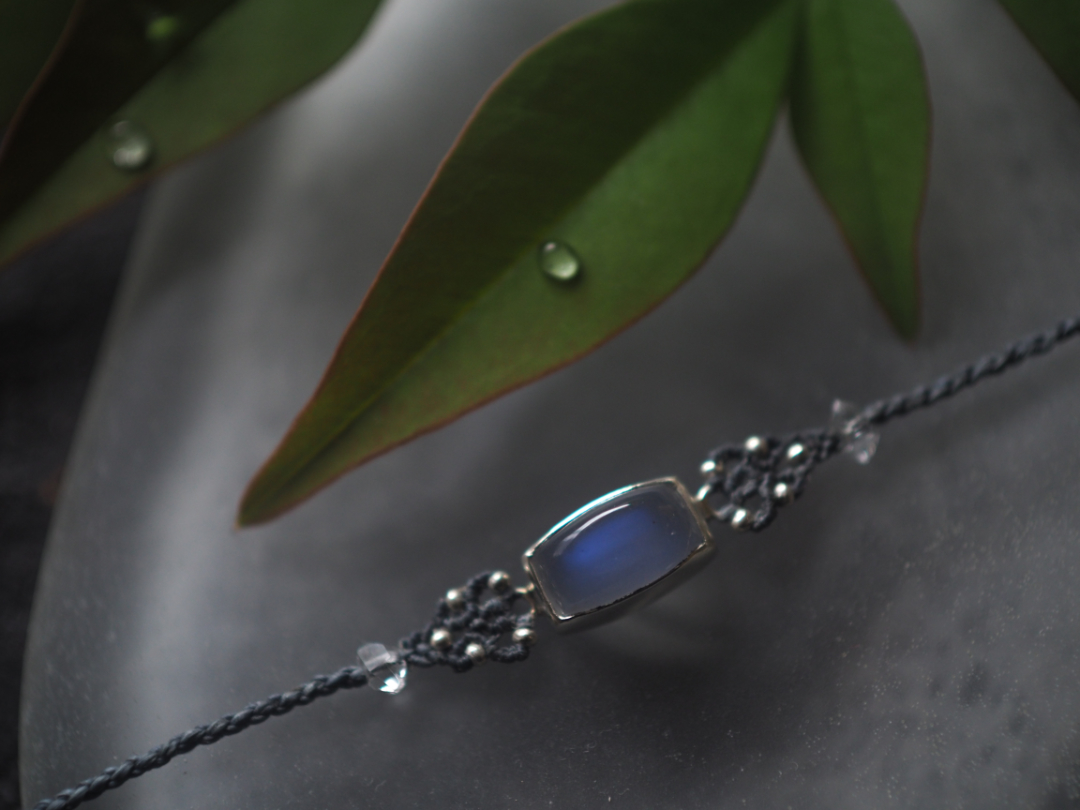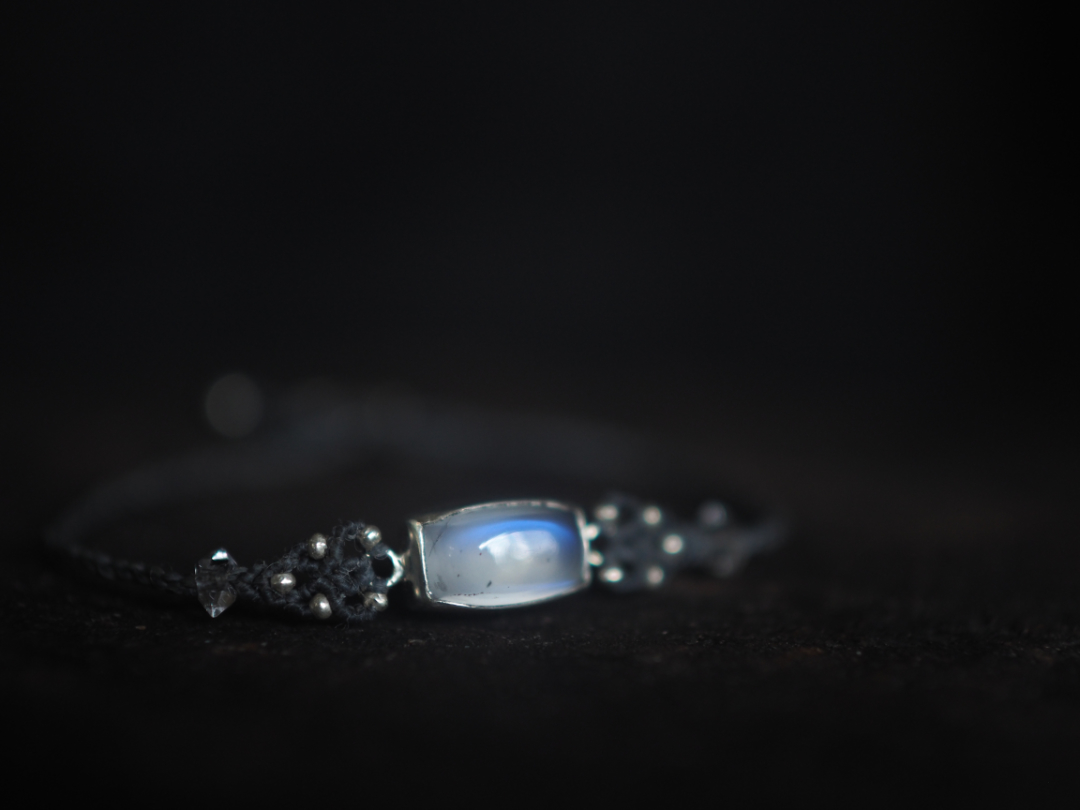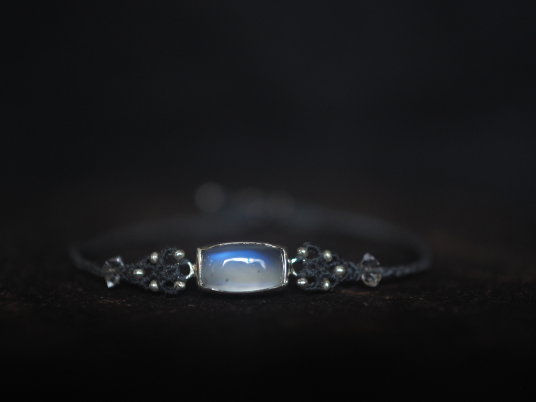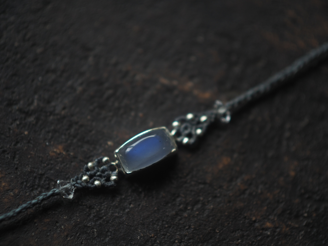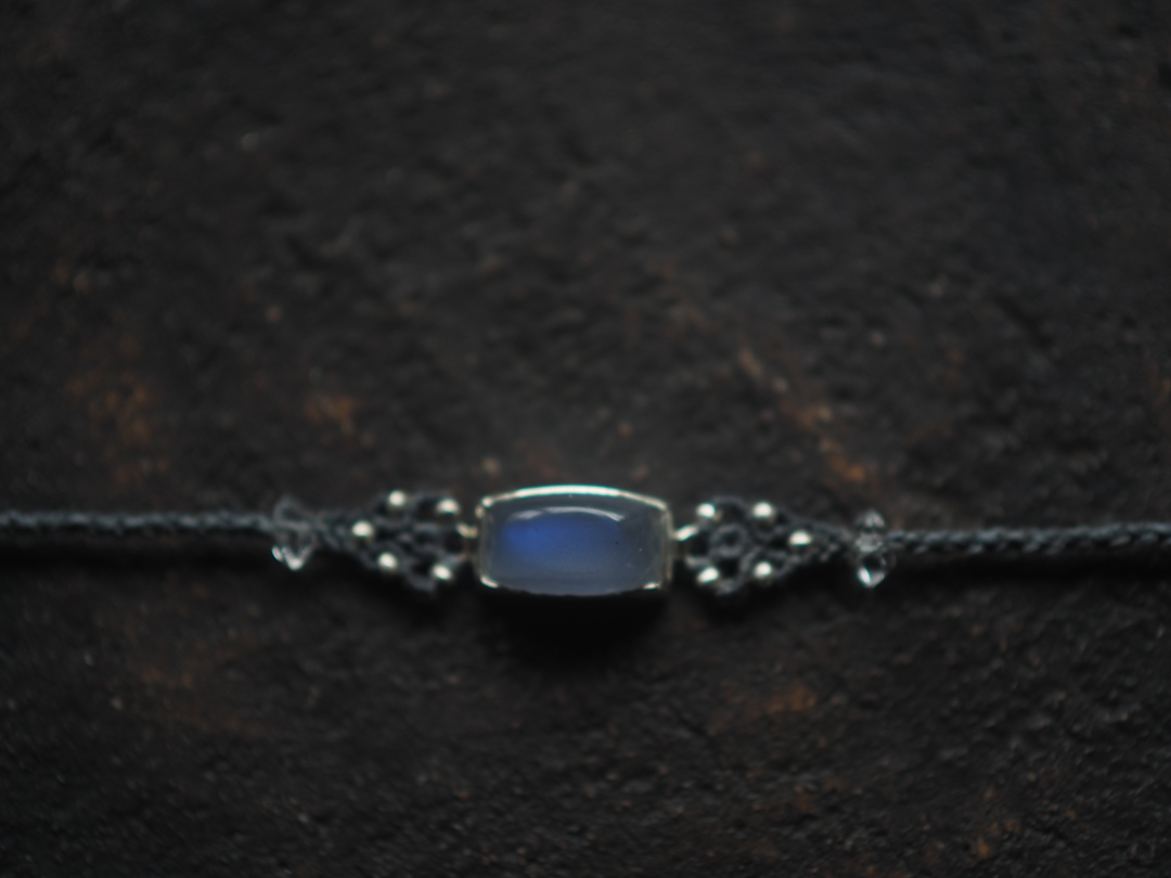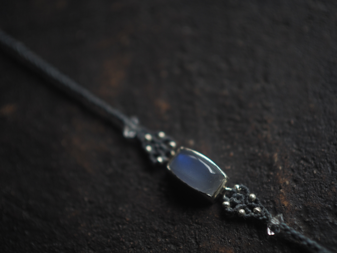 美しい青色を内包したmoonstoneをsilver 950とmacrame編みを用いて、
