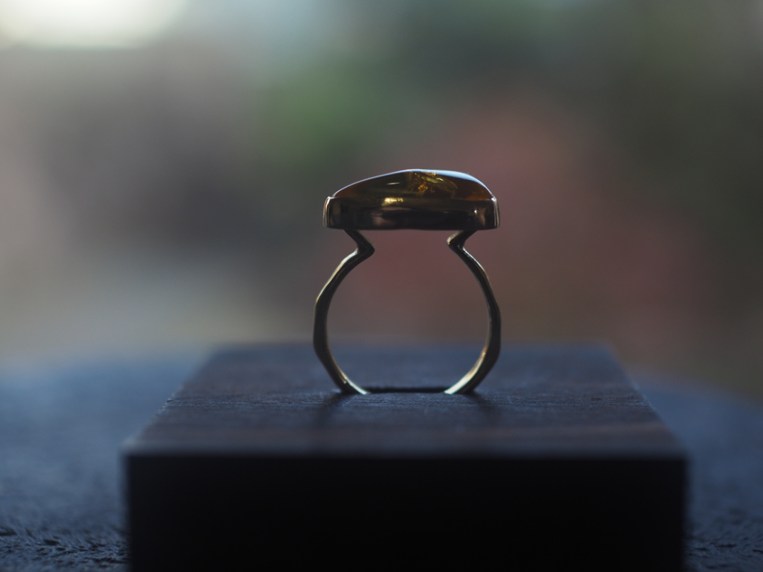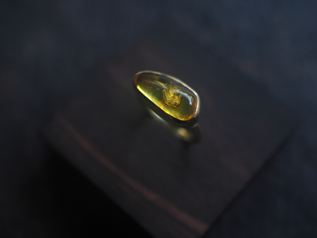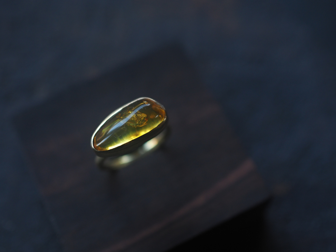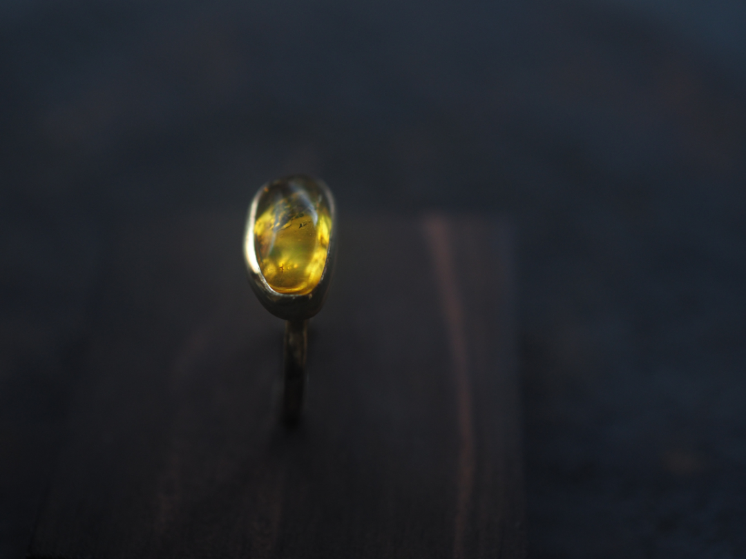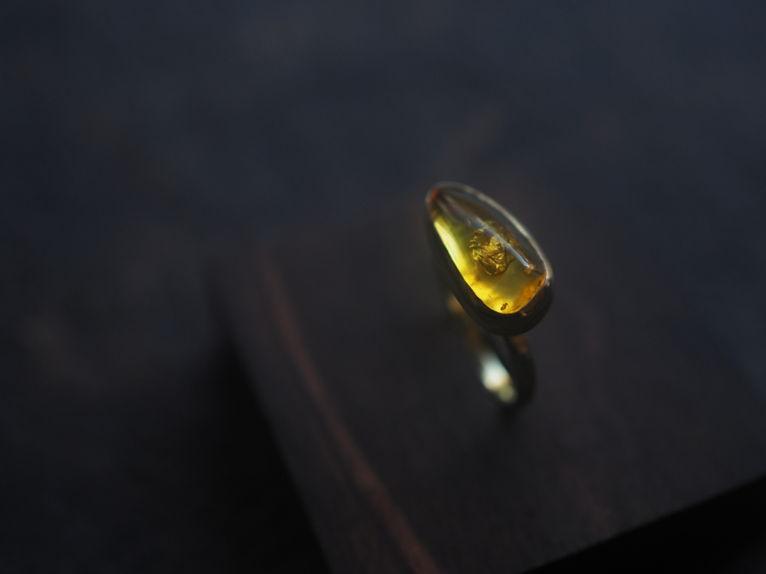 珍しい形に研磨されたamberを真鍮を用いて、ringに仕立てました。