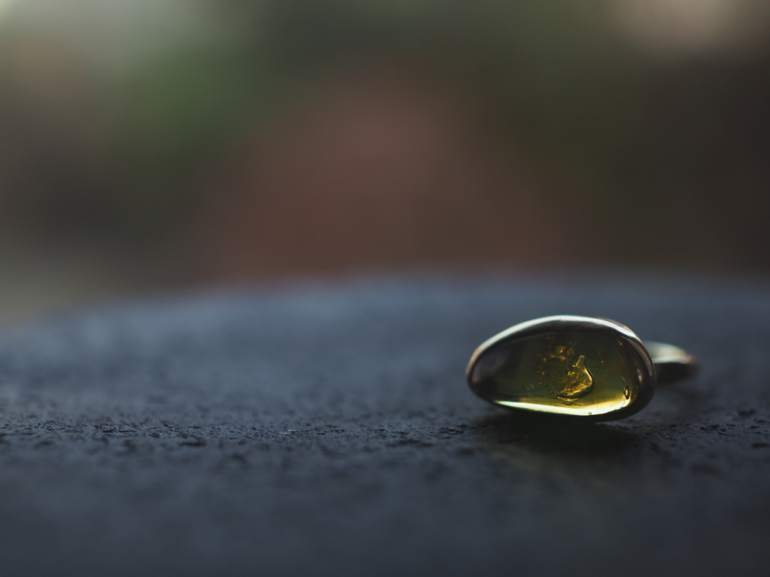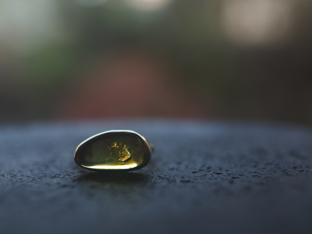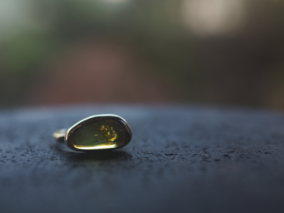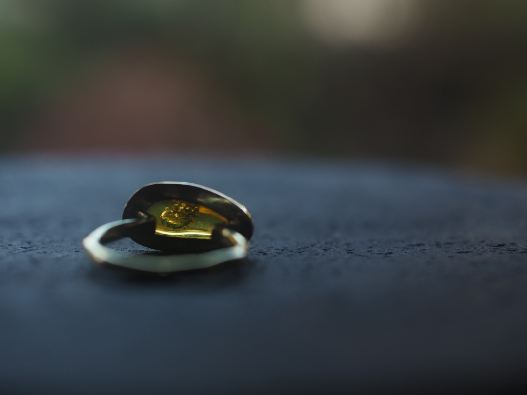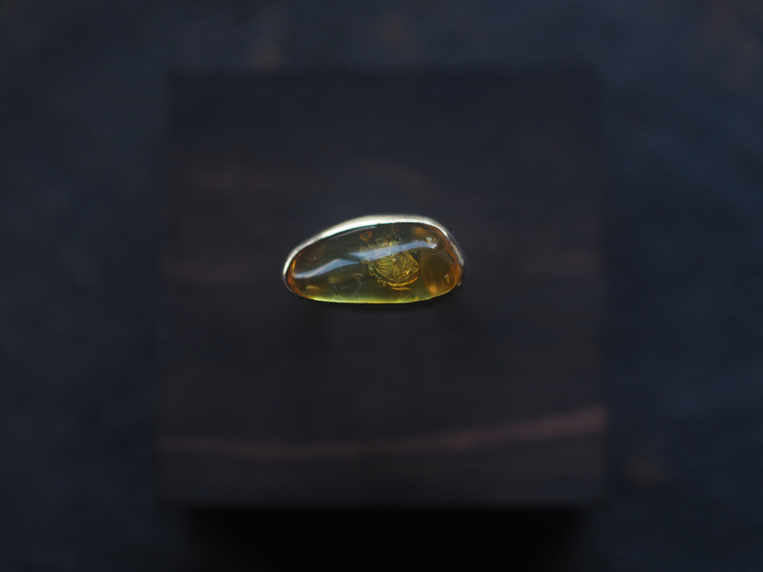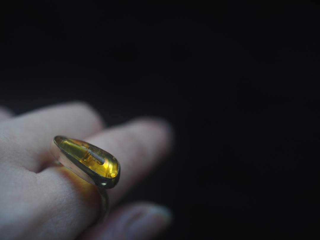珍しい形に研磨されたamberを真鍮を用いて、ringに仕立てました。
