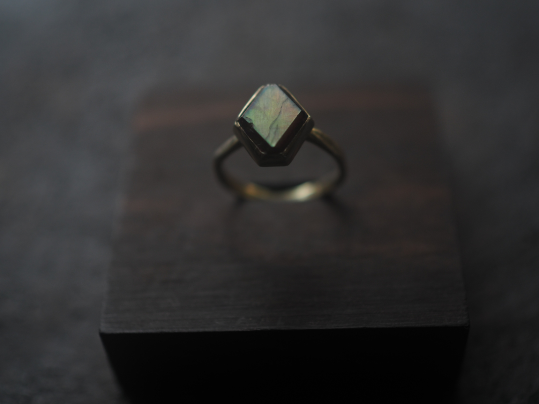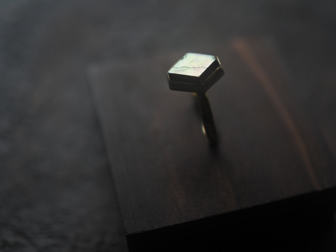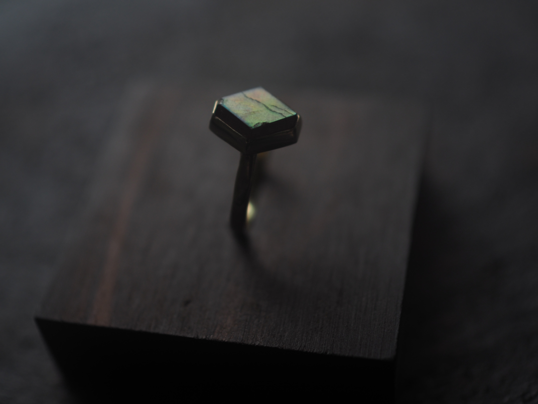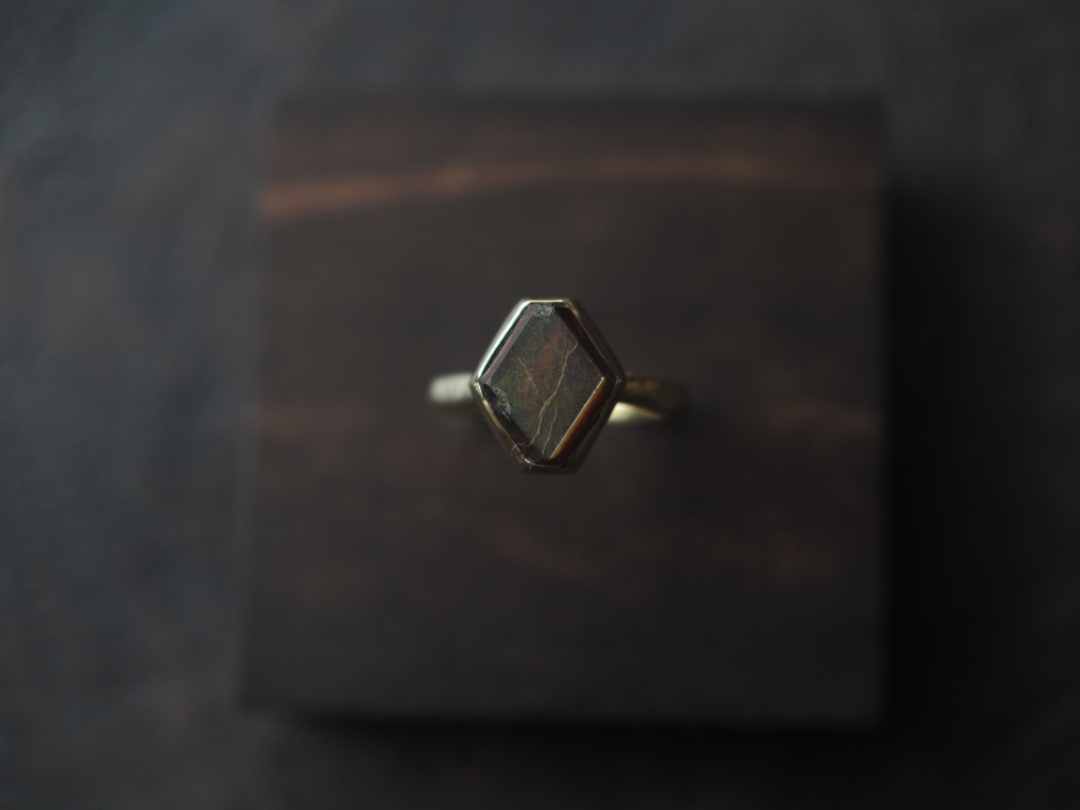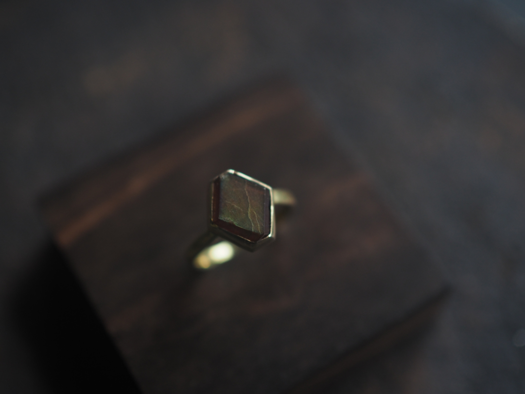 国産のrainbow garnetの原石を真鍮を用いて、ringに仕立てました。