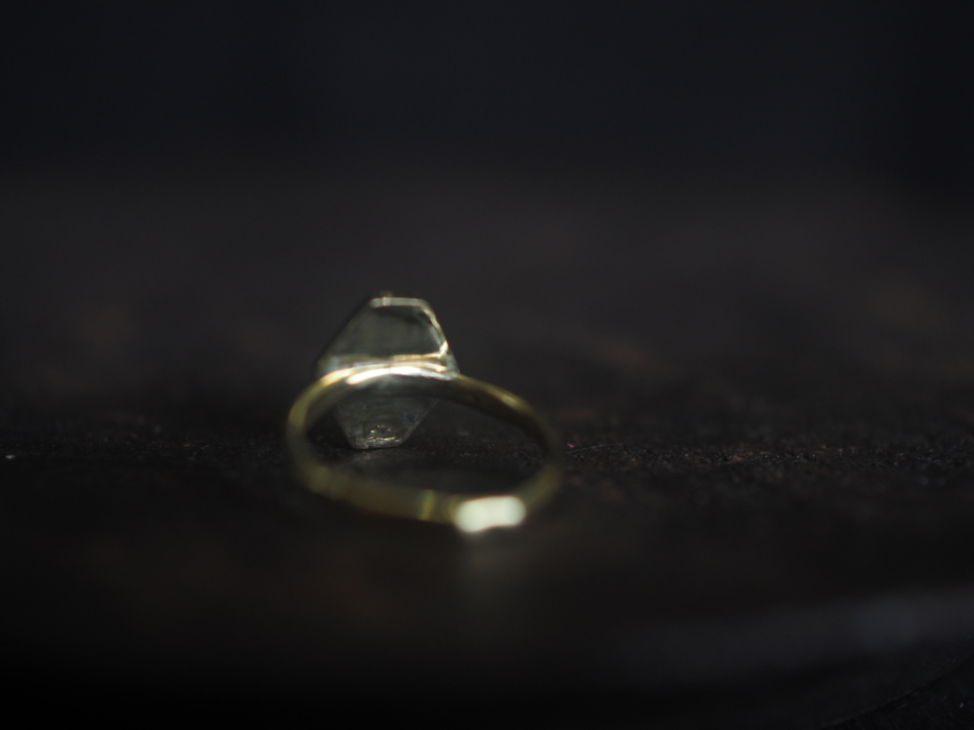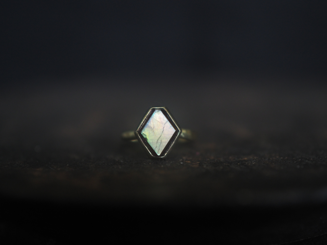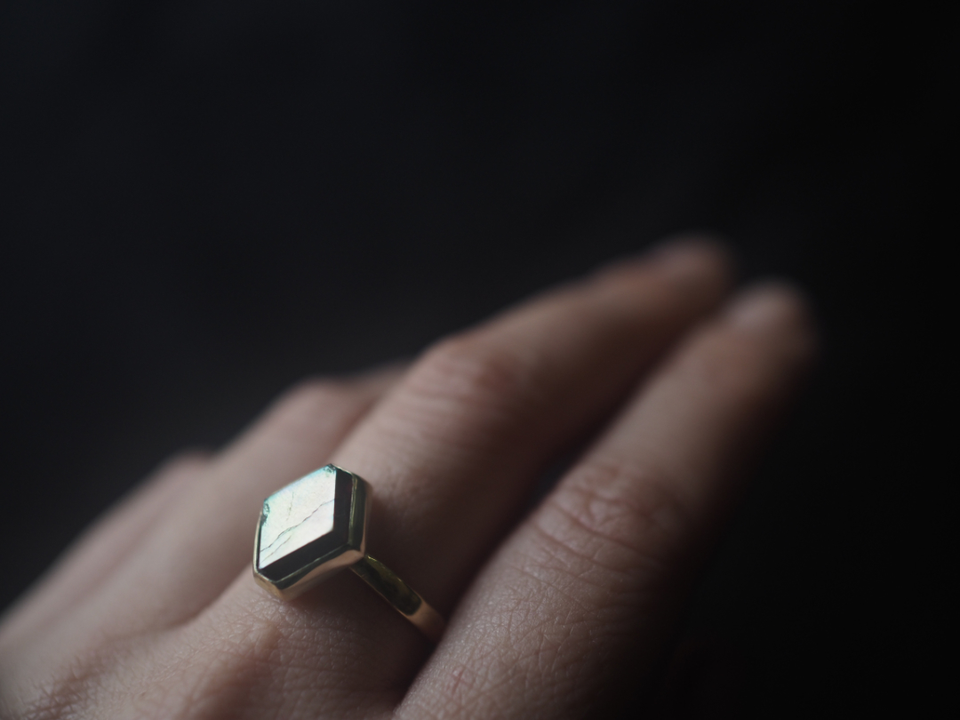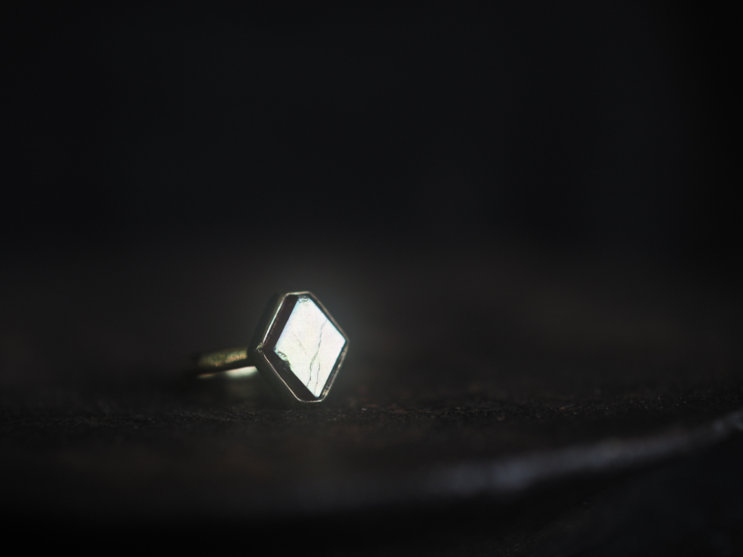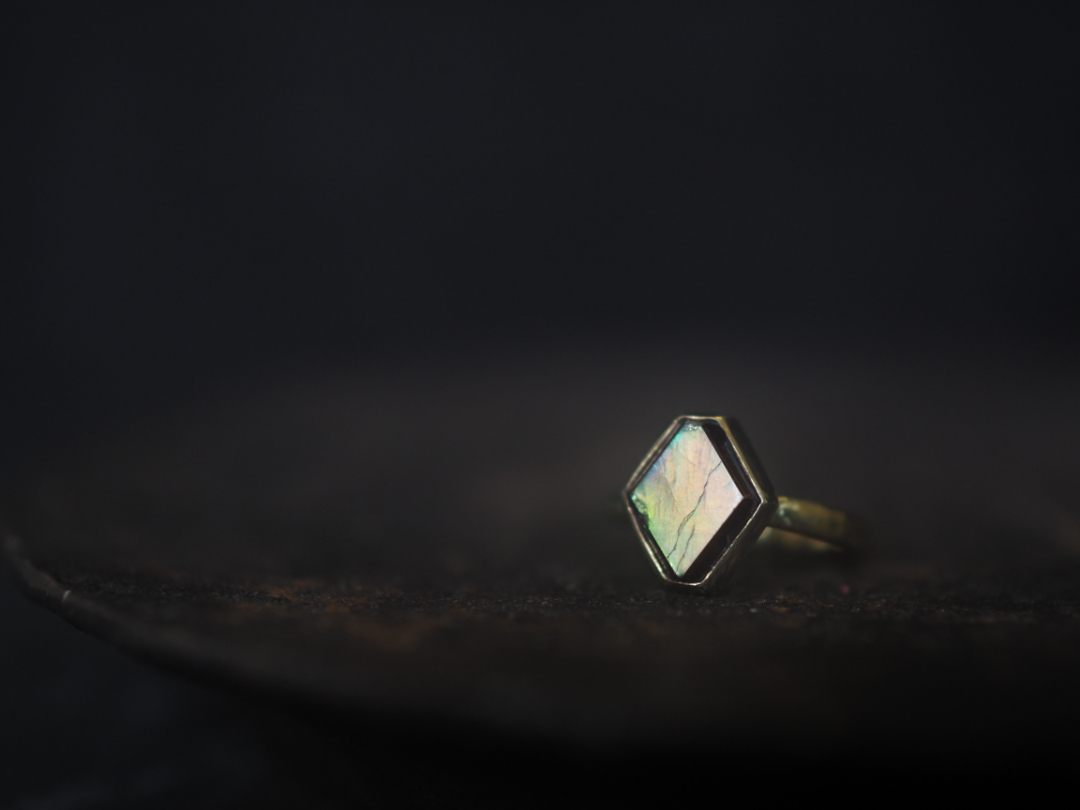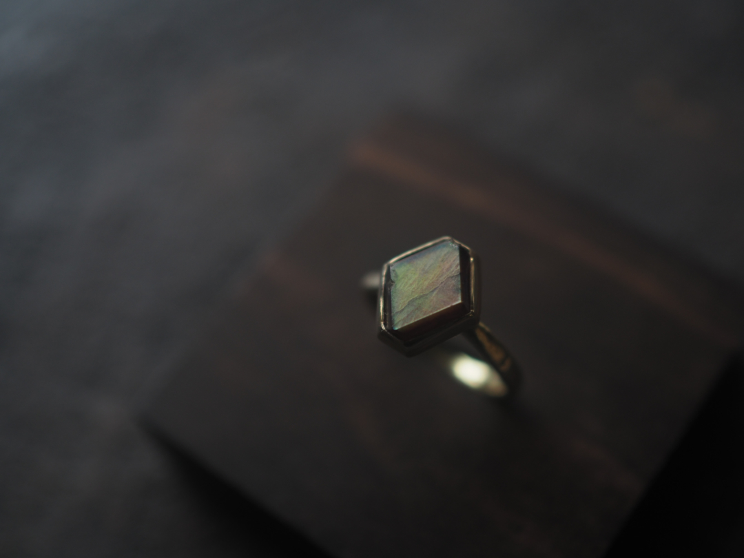 国産のrainbow garnetの原石を真鍮を用いて、ringに仕立てました。